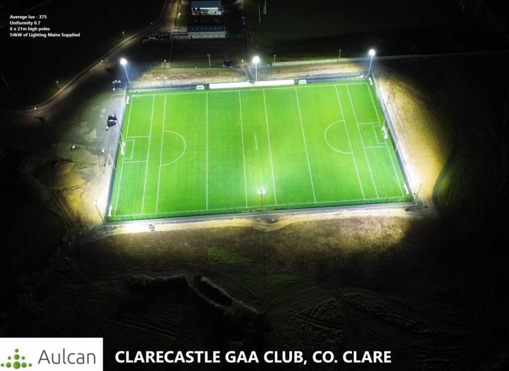 “In November of 2023 Clarecastle GAA were delighted to open the only full size Gaa AstroTurf in Co Clare. Since opening we are delighted to have hosted Intercounty matches and training sessions. The size and quality of the pitch sets a new standard to be aspired to. All users and visitors have remarked on the quality of our floodlighting system. It's fully automated and can be controlled from an app. From design to installation and aftercare the team at Aulcan Ltd were on hand to advise on and deliver the best lighting solutions for our project. We are very proud of our finished project and thankful to have engaged with Aulcan Ltd to make our dream a reality”